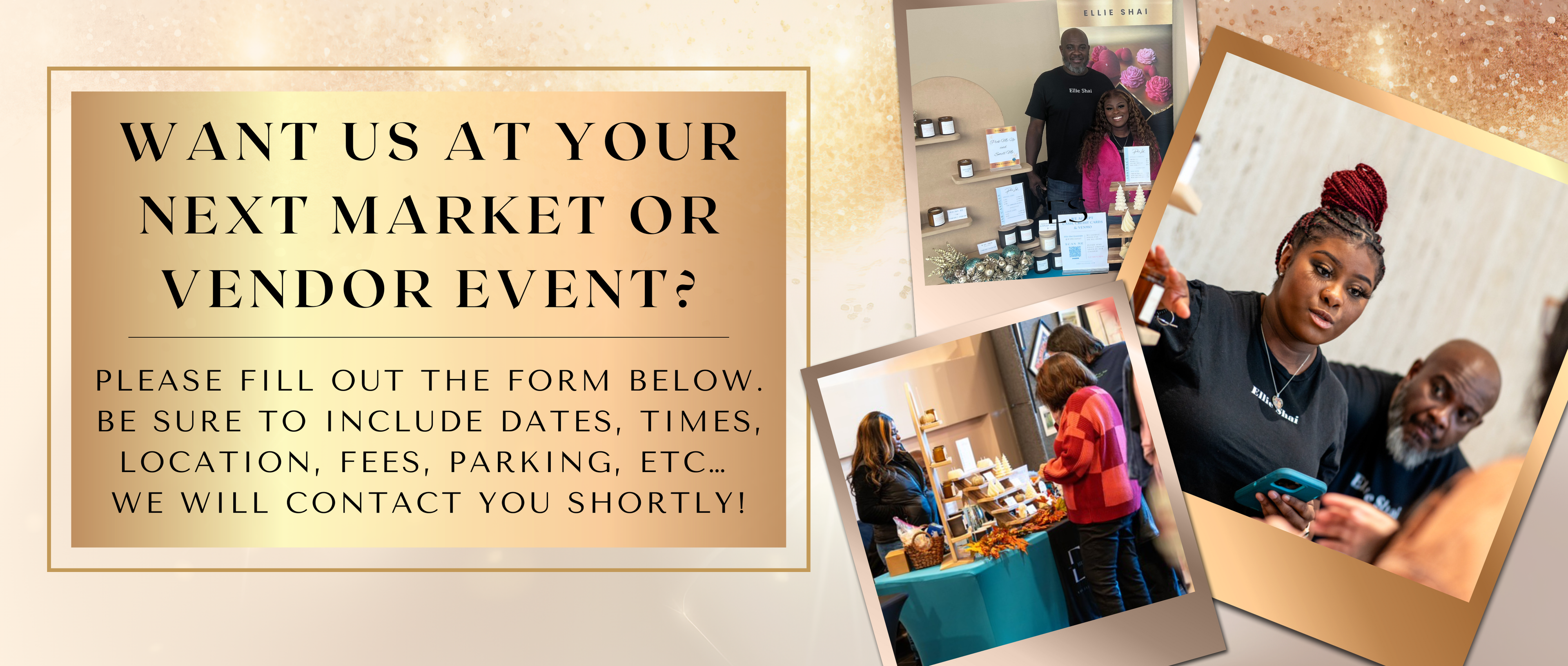 We value our customers and would love to hear from you. Questions, Comments and Product Feedback are always welcomed! This form is for Vendor Event Opportunities and Retail Orders in Processing, Shipped and/or already Delivered.